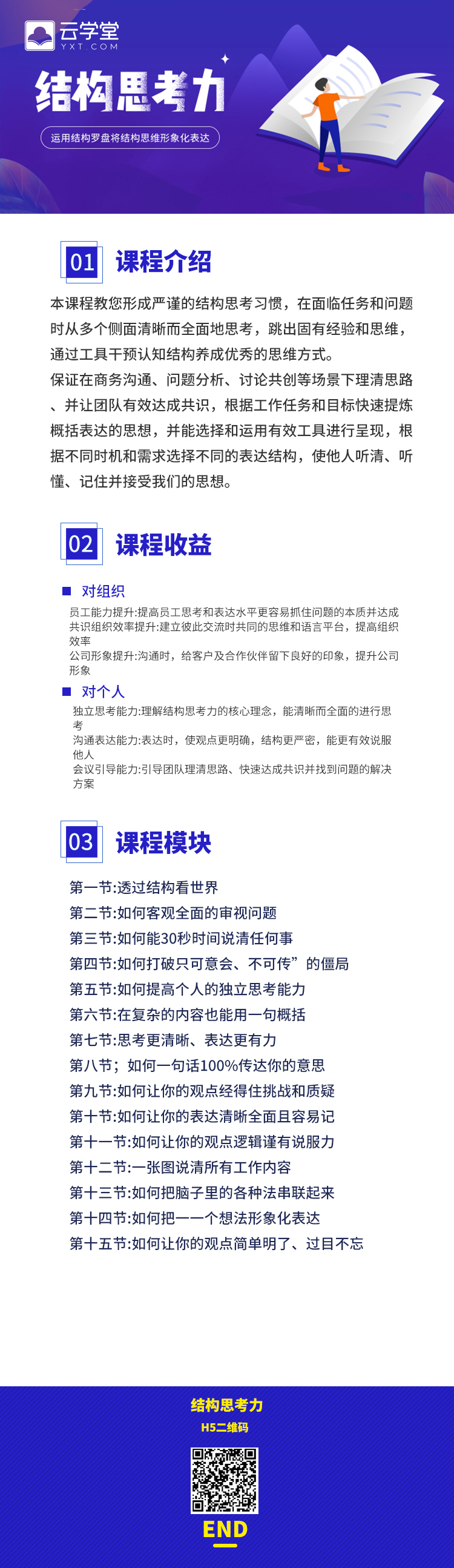 课程大纲: 三层次模型 01-【课程介绍】透过结构看世界 02-【理念】如何客观全面的审视问题? 03-【金字塔结构】如何能30秒时间说清任何事? ?隐性思维显性化 04-【识别概括】如何打破“只可意会、不能言传”的僵局? 05-【识别概括技术】如何提高个人的独立思考能力? 06-【万能公式】再复杂的内容也能一句话概括! ?显性思维结构化 07-【重构4核】思考更清晰、表达更有力 08-【论】如何一句话100%传达你的意思? 09-【证】如何让你的观点经得住挑战和质疑? 10-【类】如何让你的表达清晰全面且容易记? 11-【比】如何让你的观点逻辑严谨有说服力? ?结构思维形象化 12-【结构罗盘】一张图说清所有工作内容! 13-【配】如何把脑子里的各种想法串联起来? 14-【得】如何把一个想法形象化表达? 15-【上】如何让你的观点简单明了、过目不忘?