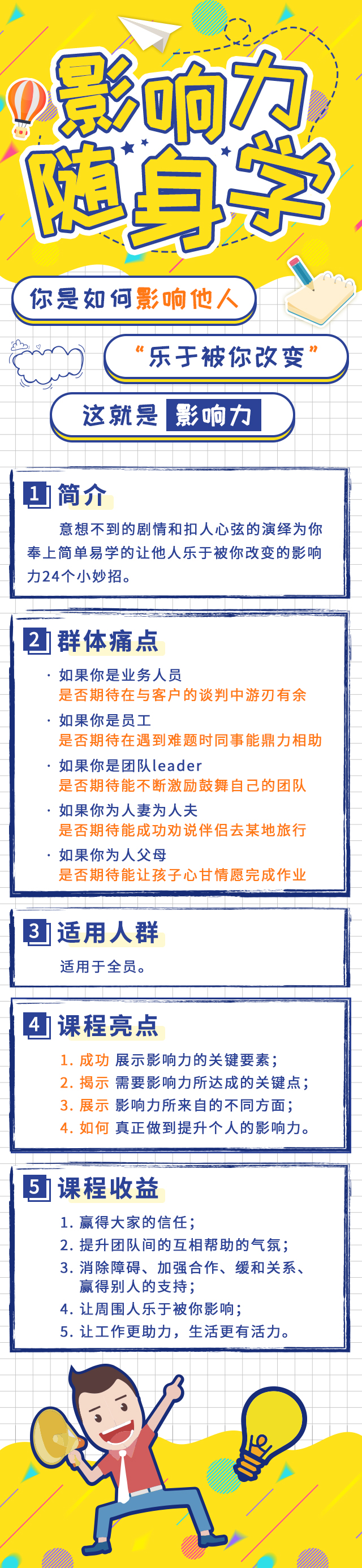 课程收益: 1. 带领团队实现目标并激励大家,要将目标聚焦在可实现性及挑战性上,同时承诺目标实现后的举措,赢得大家的信任。 (例,作为团队的领导者,你要为大家制定目标并带领大家去实现这个目标,当你的队员完成目标后,一定要给予之前的承诺以提升自己的团队影响力及团队的信任。) 2. 在团队成员或同事有困难事,要给予他援助,以提升团队间的互相帮助的气氛,当你有困难时,主动寻求帮助,因为人们比你想象得更愿意帮助你。 (例,作为团队中的一员你可以随时给予需要的对成员帮助,自然而然,当你遇到困难的时候,别人也同样愿意去帮助你。) 3. 学会做一个受欢迎的人,不要吝啬自己对于别人的赞扬,消除障碍、加强合作、缓和关系、赢得别人的支持。 4. 用正确的方式来证明自己的观点,以获取别人的信任。不要有太多的论点,反而会让对方怀疑。 (例如在你展现自己的观点的时候,要当你的论据太多的时候,很有可能会适得其反,所以课程将教会你该如何适可而止,并且不要回避你的缺点,而是知道该如何利用优势去抵消劣势。) 5. 在谈判的过程中施加自己的影响力从而获得共赢的局面。 (例,在谈判的初期,需要有“二要二不要”,从而在“让步”中达成交易。同时在你谈判的过程中通过一系列的技巧和方式,从而影响对方,为你的谈判成功提供一臂之力。)
