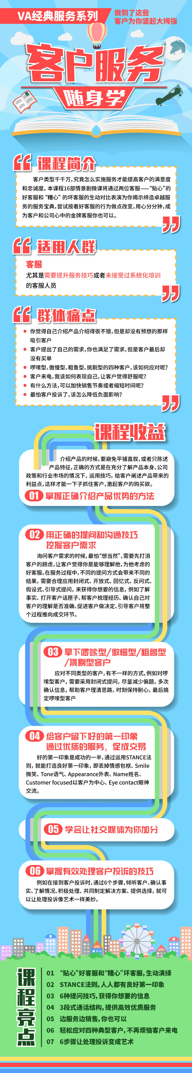 介绍产品 客户心声 售后服务 善用你的生意 提问技巧 服务啰嗦型客户 服务粗鲁型客户 服务傲慢型客户 服务挑剔型客户 客户来电 良好的第一印象 如何与人接触 社交媒体的喜与忧 销售服务宝典 行为的力量 处理投诉的艺术