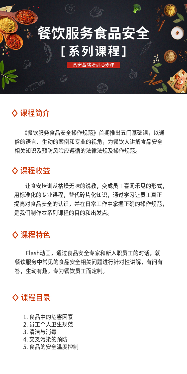 2018年6月22日,国家市场监管总局出台了新版《餐饮服务食品安全操作规范》,并于2018年10月1日起正式实施。新版《规范》第14.2条款规定:餐饮服务企业应每年对其从业人员进行一次食品安全培训考核,考核内容为有关餐饮食品安全的法律法规知识、基础知识及本单位食品安全管理制度、加工制作规程。为帮助餐饮企业尽快了解和掌握新版《规范》,加强本单位人员培训,朱丽亚管理咨询(北京)有限公司结合多年来在餐饮安全服务领域的经验,依据新版《规范》编写和制作了《餐饮服务食品安全系列课程》,以通俗的语言、生动的案例和专业的视角,为餐饮人讲解食品安全知识和预防风险应遵循的法律法规及操作规范。