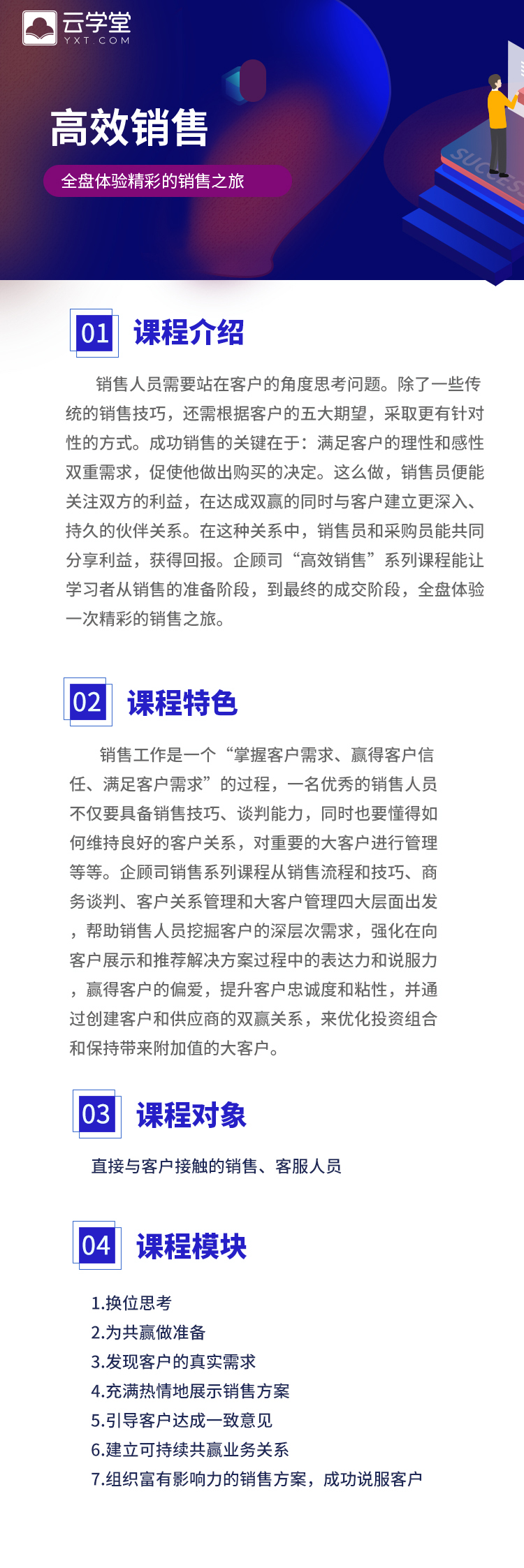 销售人员需要站在客户的角度思考问题。除了一些传统的销售技巧,还需根据客户的五大期望,采取更有针对性的方式。成功销售的关键在于:满足客户的理性和感性双重需求,促使他做出购买的决定。这么做,销售员便能关注双方的利益,在达成双赢的同时与客户建立更深入、持久的伙伴关系。在这种关系中,销售员和采购员能共同分享利益,获得回报。企顾司“高效销售”系列课程能让学习者从销售的准备阶段,到最终的成交阶段,全盘体验一次精彩的销售之旅。备注:如您第一次使用IE浏览器学习企顾司的课程,需要配置下浏览器,请把这两个域名,加到Internet选项“安全”标签里“受信任的站点”。*.cegos.asia*.easyams.net