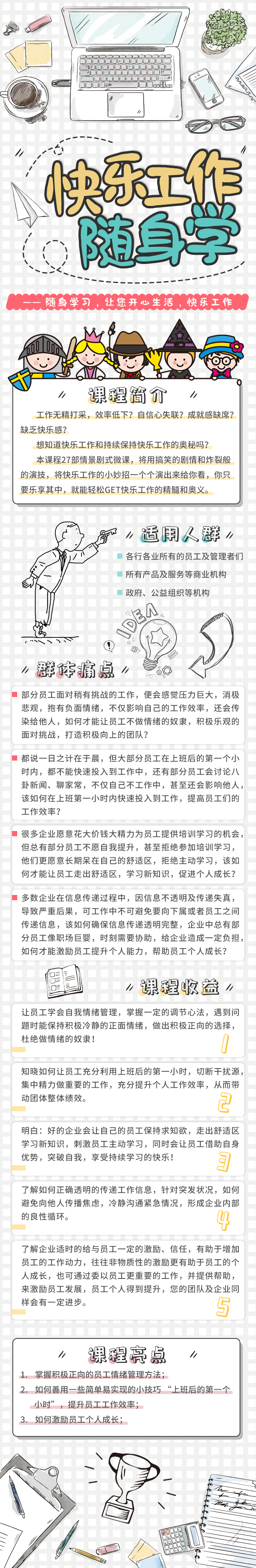 工作无精打采,效率低下?自信心失联?成就感缺席?工作缺乏快乐感?想知道快乐工作和持续保持快乐工作的奥秘吗?本课程27部情景剧式微课,将用搞笑的剧情和炸裂般的演技,将快乐工作的小妙招一个个演出来给你看,你只要乐享其中,就能轻松get快乐工作的精髓和奥义。