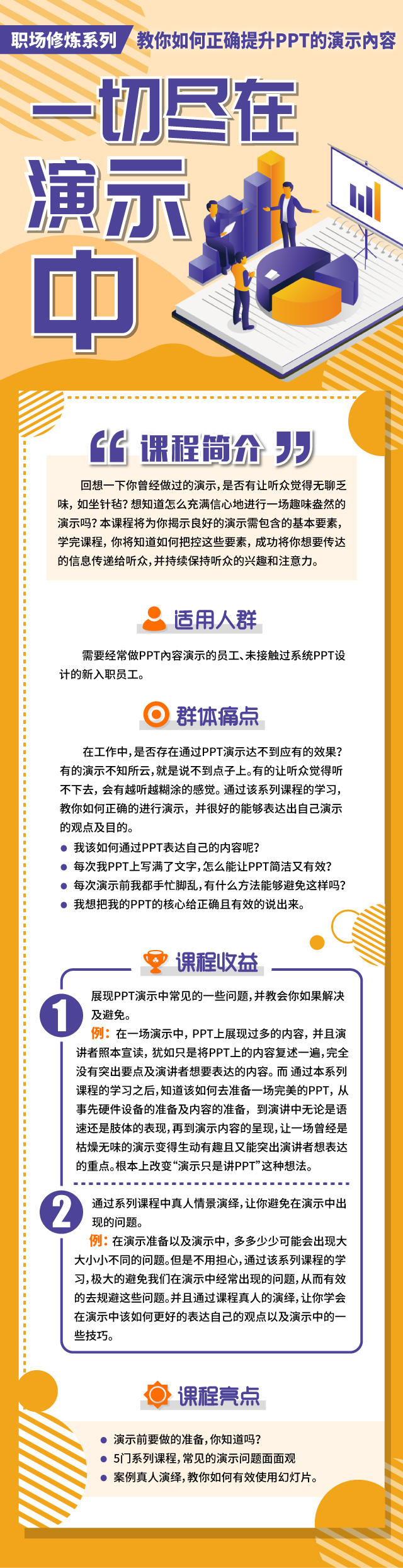 回想一下你曾经做过的演示,是否有让听众觉得无聊乏味,如坐针毡?想知道怎么充满信心地进行一场趣味盎然的演示吗?本课程将为你揭示良好的演示需包含的基本要素,学完课程,你将知道如何把控这些要素,成功将你想要传达的信息传递给听众,并持续保持听众的兴趣和注意力。