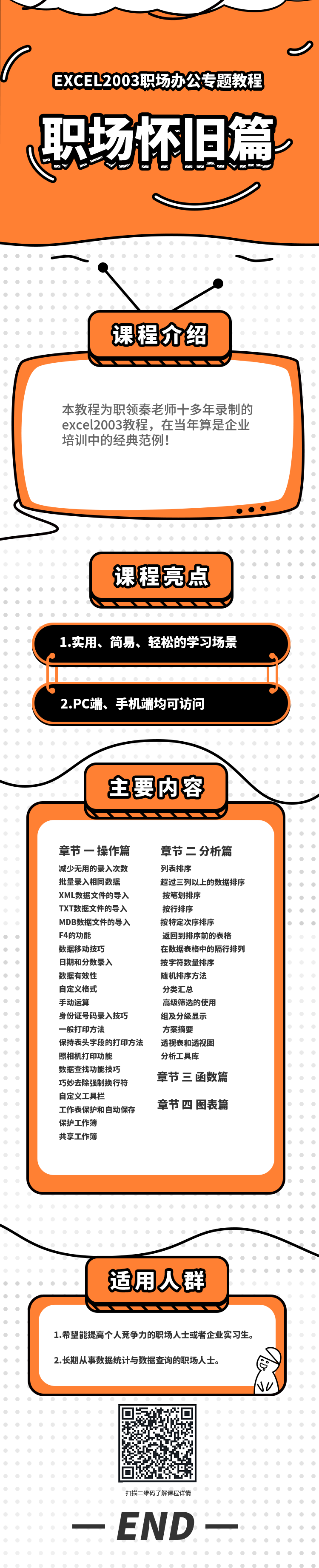 本教程为职领秦老师十多年录制的excel2003教程,在当年算是企业培训中的经典范例!