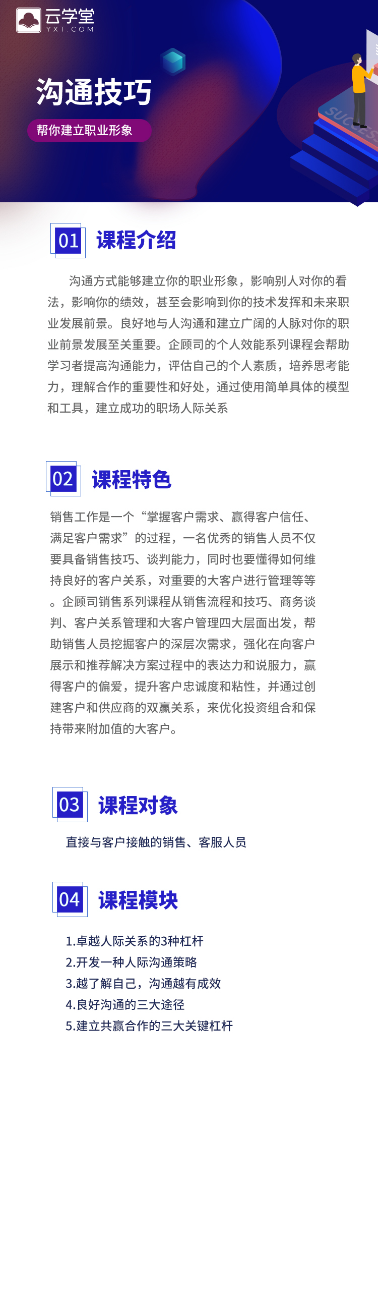沟通方式能够建立你的职业形象,影响别人对你的看法,影响你的绩效,甚至会影响到你的技术发挥和未来职业发展前景。良好地与人沟通和建立广阔的人脉对你的职业前景发展至关重要。企顾司的个人效能系列课程会帮助学习者提高沟通能力,评估自己的个人素质,培养思考能力,理解合作的重要性和好处,通过使用简单具体的模型和工具,建立成功的职场人际关系