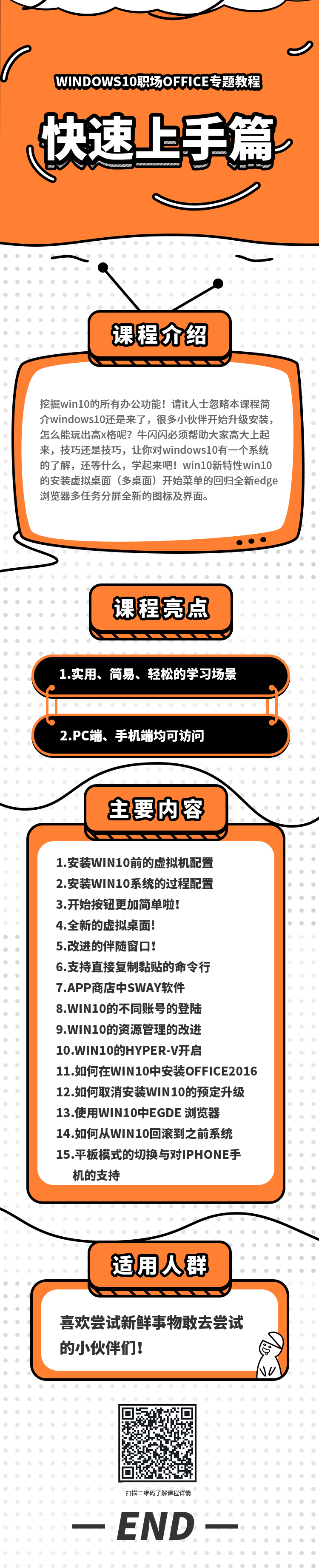 适用人群: 系统尝试新鲜事物敢去尝试的小伙伴们!课程我们会持续更新,挖掘win10的所有办公功能!请it人士忽略本课程 简介 windows10还是来了,很多小伙伴开始升级安装,怎么能玩出高x格呢?牛闪闪必须帮助大家高大上起来,技巧还是技巧,让你对windows10有一个系统的了解,还等什么,学起来吧! win10新特性 win10的安装 虚拟桌面(多桌面) 开始菜单的回归 全新edge浏览器 多任务分屏 全新的图标及界面