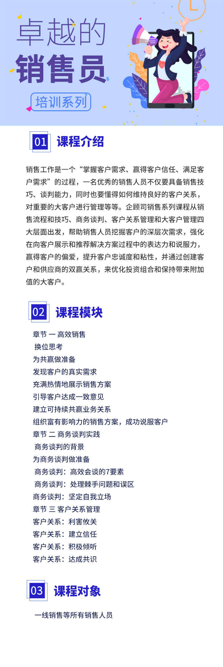 销售工作是一个“掌握客户需求、赢得客户信任、满足客户需求”的过程,一名优秀的销售人员不仅要具备销售技巧、谈判能力,同时也要懂得如何维持良好的客户关系,对重要的大客户进行管理等等。企顾司销售系列课程从销售流程和技巧、商务谈判、客户关系管理和大客户管理四大层面出发,帮助销售人员挖掘客户的深层次需求,强化在向客户展示和推荐解决方案过程中的表达力和说服力,赢得客户的偏爱,提升客户忠诚度和粘性,并通过创建客户和供应商的双赢关系,来优化投资组合和保持带来附加值的大客户。备注:如您第一次使用IE浏览器学习企顾司的课程,需要配置下浏览器,请把这两个域名,加到Internet选项“安全”标签里“受信任的站点”。 *.cegos.asia *.easyams.net